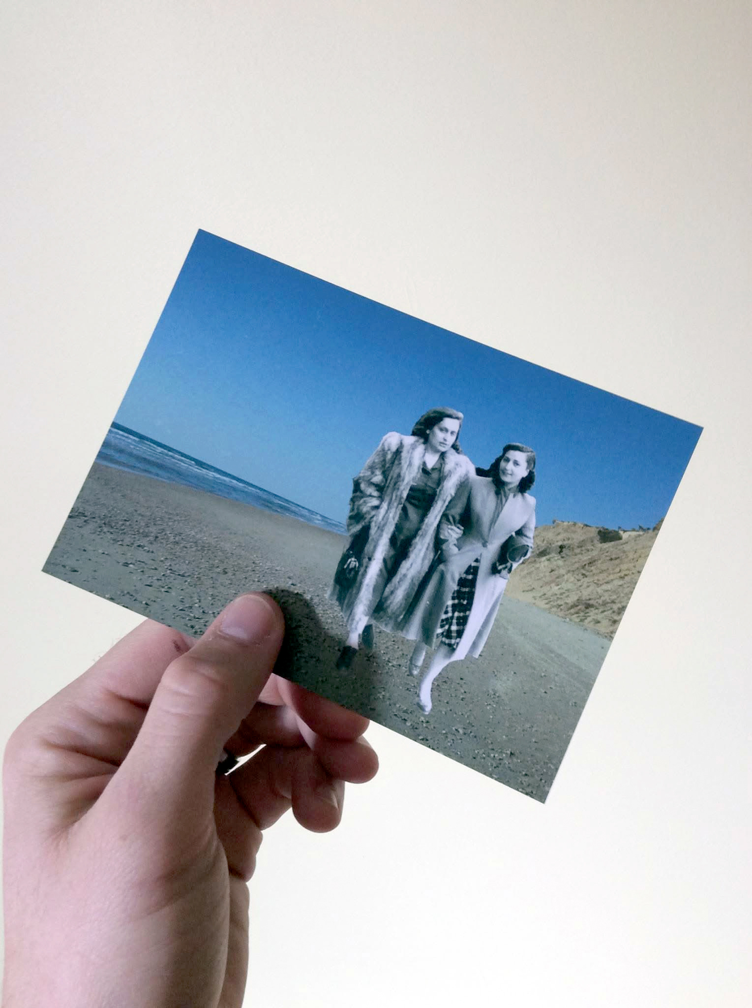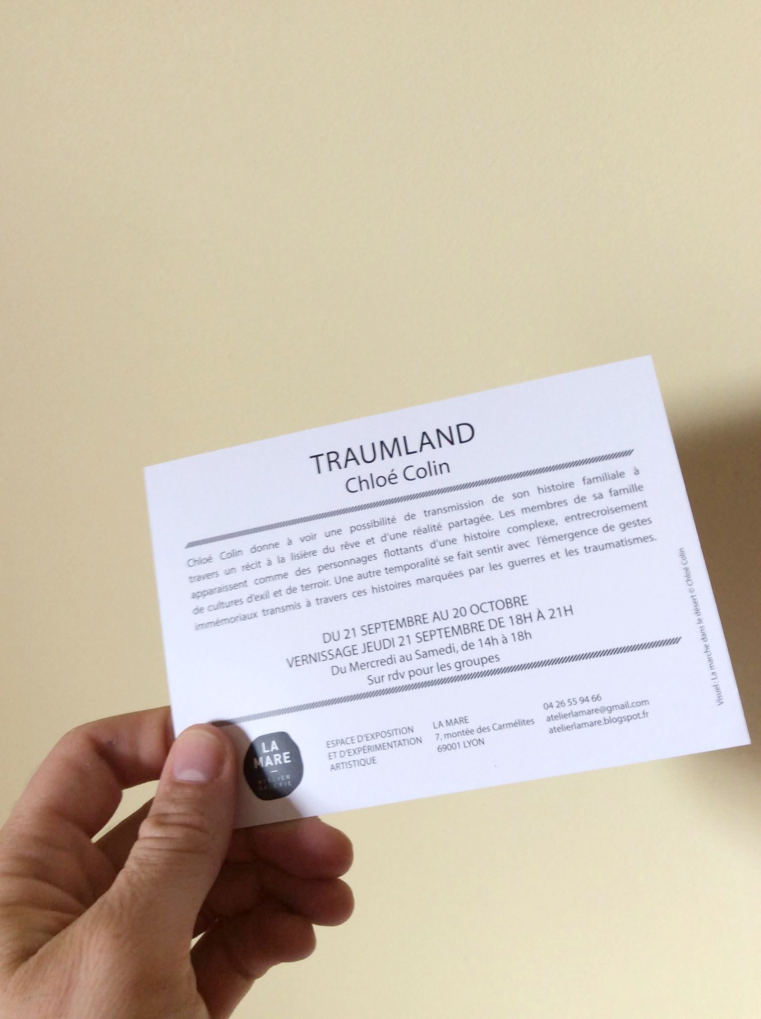 En utilisant le procédé de photomontage, je brouille les codes entre le documentaire et la fiction, les photographies de famille et les paysages idéalisés de la carte postale. Je cherche ainsi à confronter le «Traum», rêve en allemand et le «Trauma» dans un processus, qui renvoie à la méthode de l’association libre dans le traitement analytique et aux propositions visuelles du courant surréaliste.