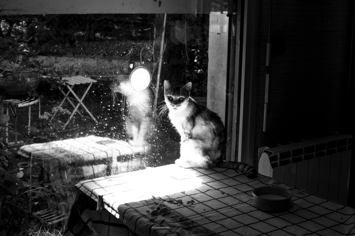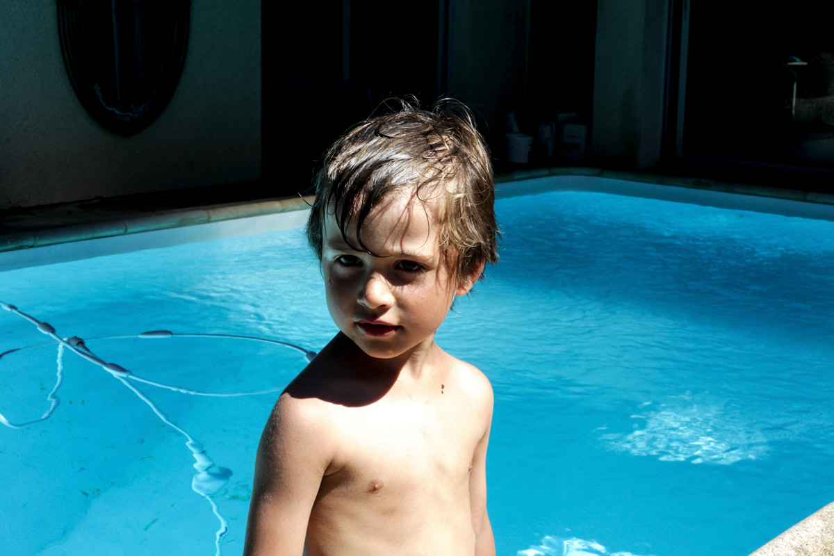 J’observe les chats, qui sont devenus les maîtres absolus du royaume de mon enfance. Ils se reposent de leur nuit de chasse et d’errance. Un chat dort tranquillement sur la chaise bébé, dont le rotin est usé et dont l’assise a été remplacée par un dessous-de-plat carré et rigide blanc, en céramique et bois. Un chat m’observe à son tour depuis la table ronde du fond du jardin. Je m’approche doucement pour le photographier. Il me fixe, prêt à déguerpir si besoin. C’est un nouveau, Pimpim, fils de voyelle, le chouchou du moment. Il n’est pas sauvage mais il ne me connaît pas encore. Je retrouve aussi mon compagnon Jules, le robot qui nettoie la piscine. Le conjoint de ma sœur s’appelle également Jules Je remarque quelques dérèglements. Son jet sort de manière imprévue d’un bout à l’autre de la piscine. Il arrose les portes vitrées, le long miroir ovale. Il risque bientôt de m’arroser moi, mon ordinateur et mon appareil photo, si je ne reste pas sur mes gardes.
