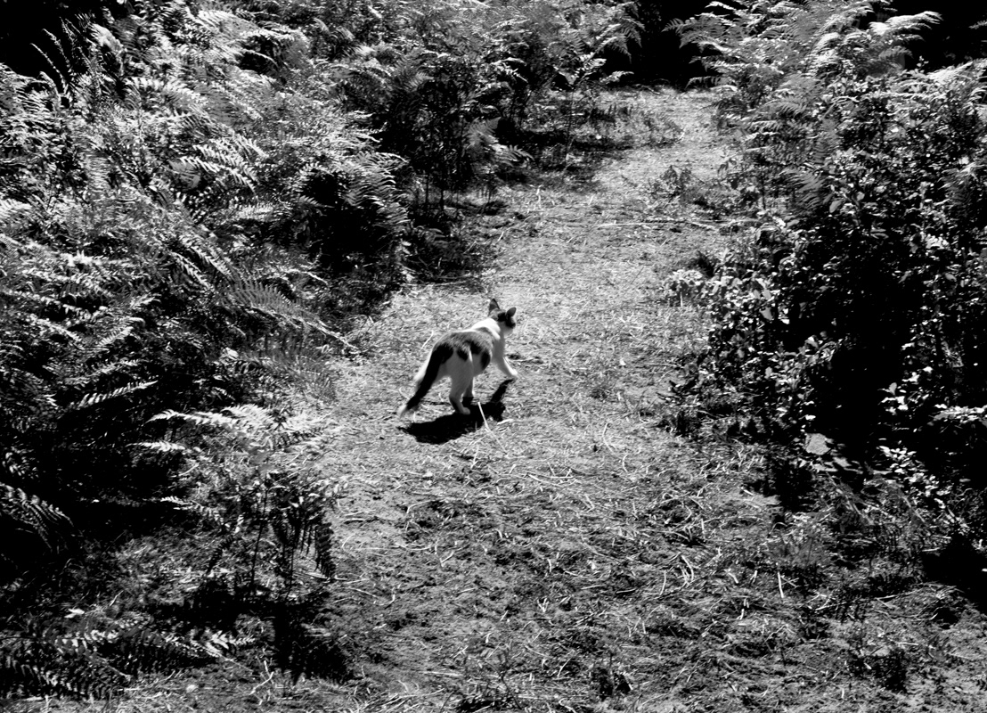 Mes sens sont à l’affût, en éveil. Je sens ce petit vent, qui vient de temps de temps caresser mon visage, mes jambes, mes oreilles pour s’éteindre aussi rapidement. Le soleil perce aussi de manière imprévue. Je le suis ainsi que toutes les ombres végétales qu’il fait danser devant moi. Et puis, cette odeur, celle des pins, qui se mêle depuis quelques années à celle des chats. L’odeur des chats m’entête, me prend le nez. J’éternue. Mon nez coule.