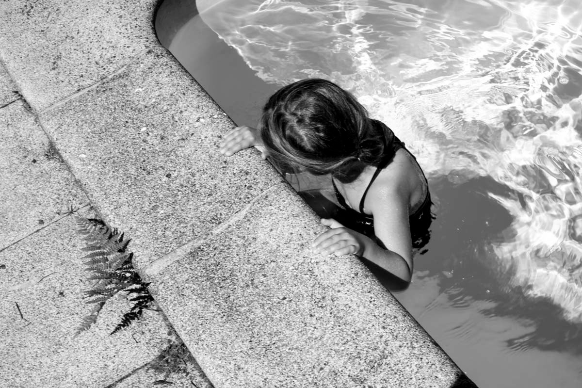 A l’arrivée dans les lieux de mon enfance, j’ai déjà un parcours bien défini. Je commence par les abords de la piscine. Les herbes folles ont été tondues par un nouveau jardinier. Il ne reste que quelques fougères. Elles sont grillées par le soleil. Le sol est sec et rugueux. Je retrouve les parasols rayés bleus et blancs couchés, hors d’état de nuire. Les tables rondes sont rouillées par le temps. Deux pots de fleurs majestueux, d’un ton vert jade, encadrent la piscine. Ils étaient dans mon enfance toujours fleuris. Je crois que c’étaient des géraniums roses et blancs.